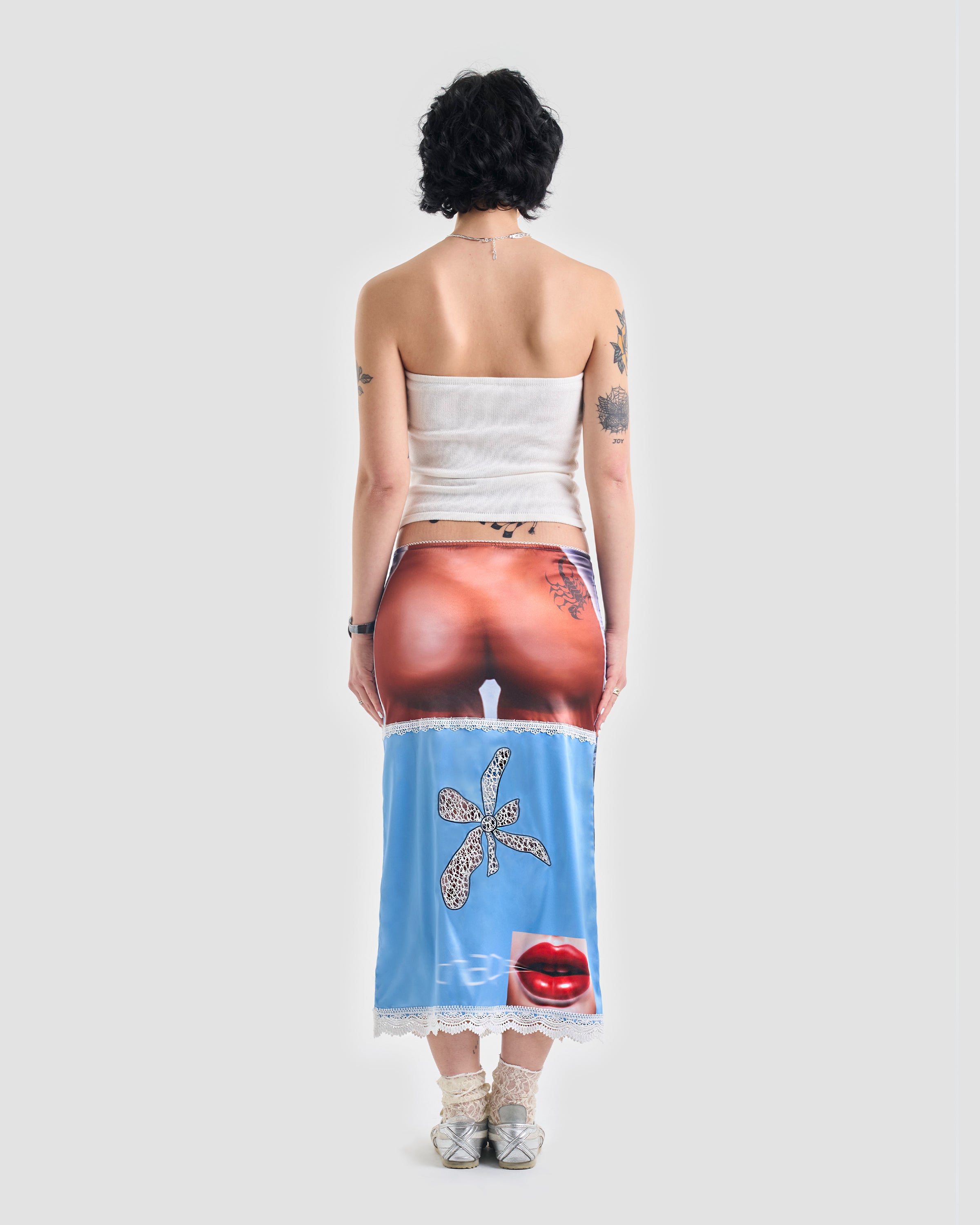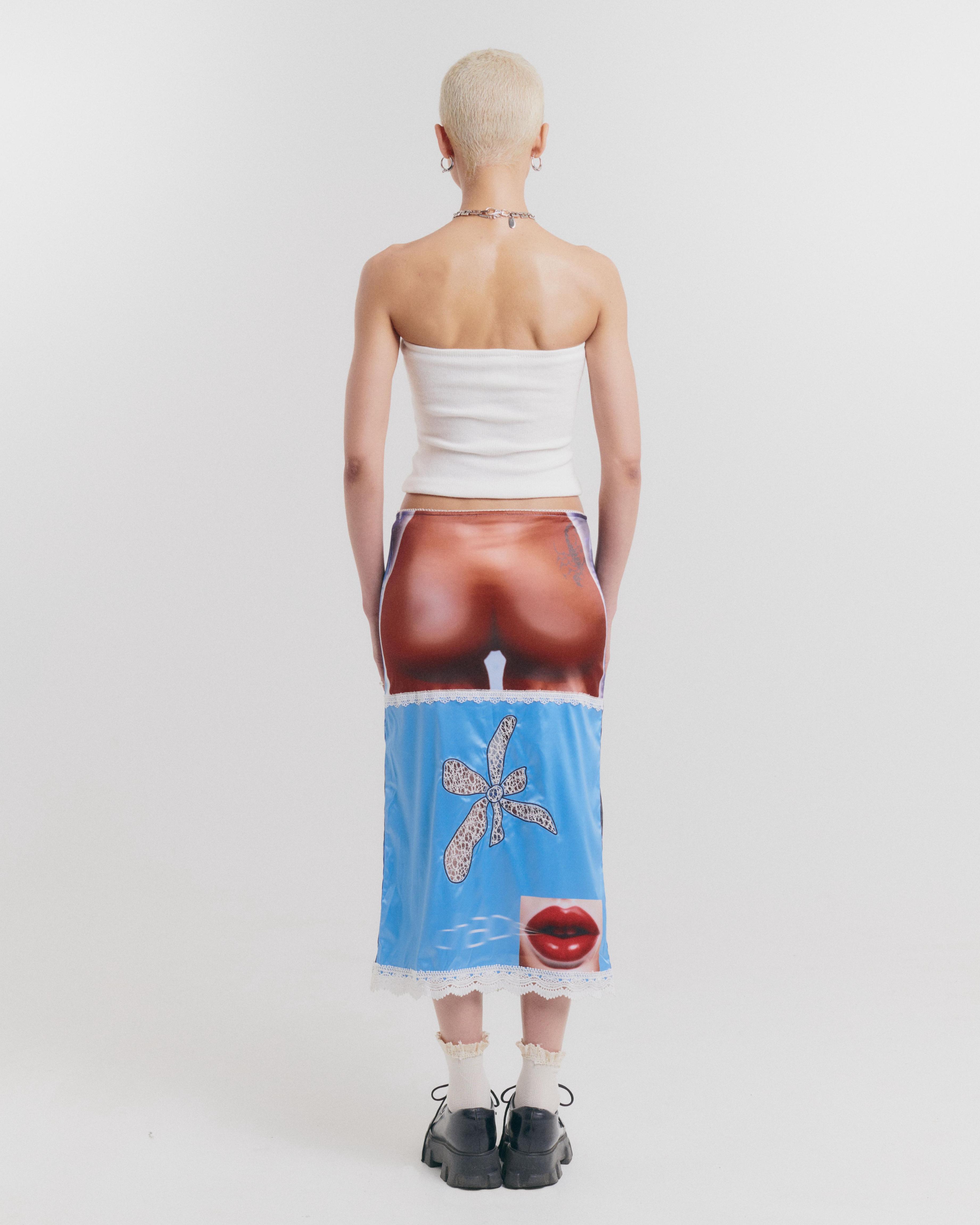 The stand-out piece of your dreams, this unique and conceptual piece was made a reality by our super talented Designer and Graphic Designer in the heart of our studio concept store. Featuring a mesmerising AI generated and hand-enhanced graphic of an eye at the front - you'll never guess whats waiting for you at the back... Bear it all with perfectly bronzed buns framed by some innocently pretty lace, finished with a bow cut-out.