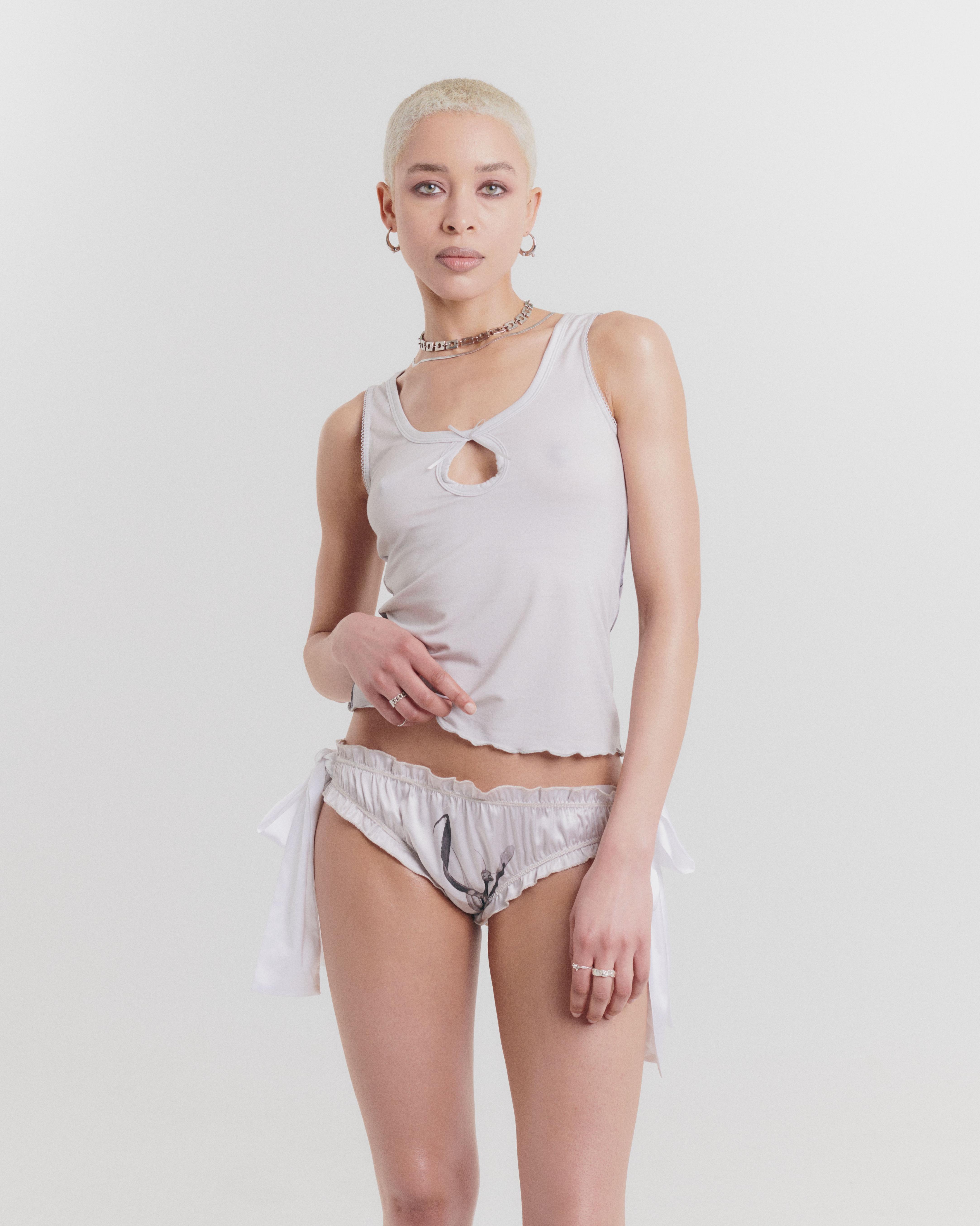 A soft, jersey tank top with a vintage science textbook print of a mantis and a grasshopper on the back. It sits on the hips and has a scoop neck with a cut-out detail.