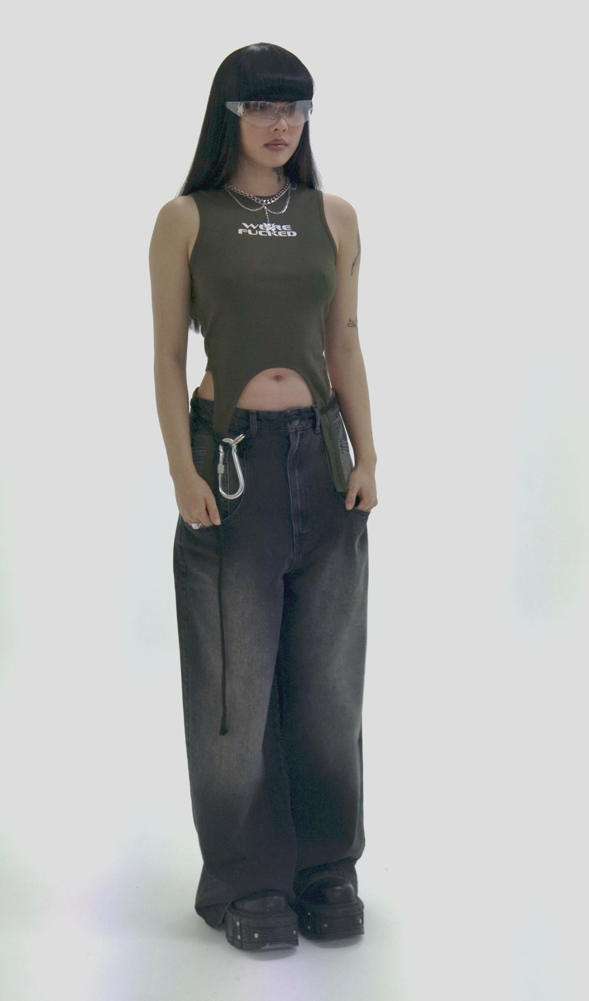 For those of you who dream of open backs, this is the Effy Backless tank top with suspender detail and slogan graphic on front in brown, featuring tie up detail at the back. Keep it casual or or create the whole fit with the PHAT Trousers and Estelle Glasses.