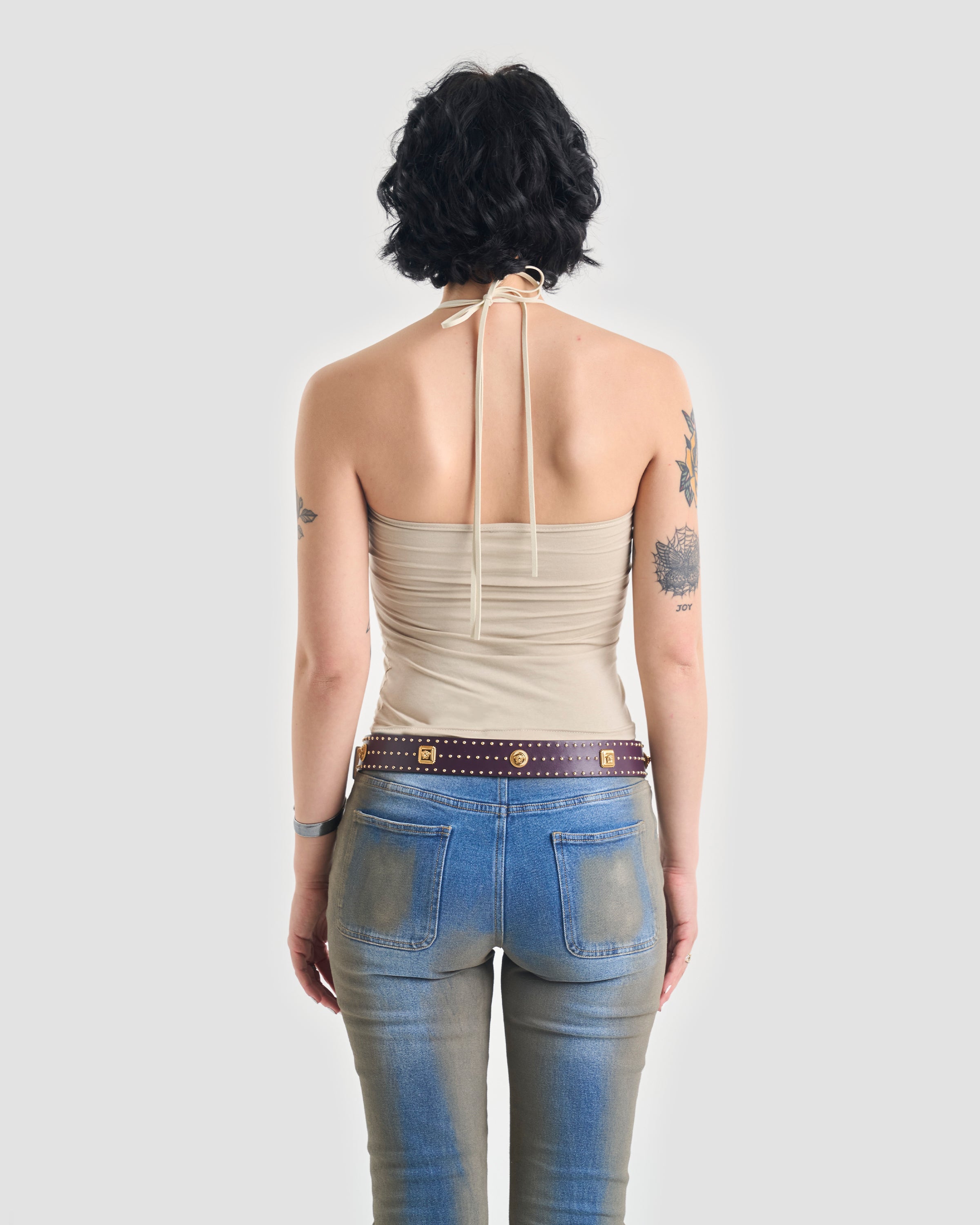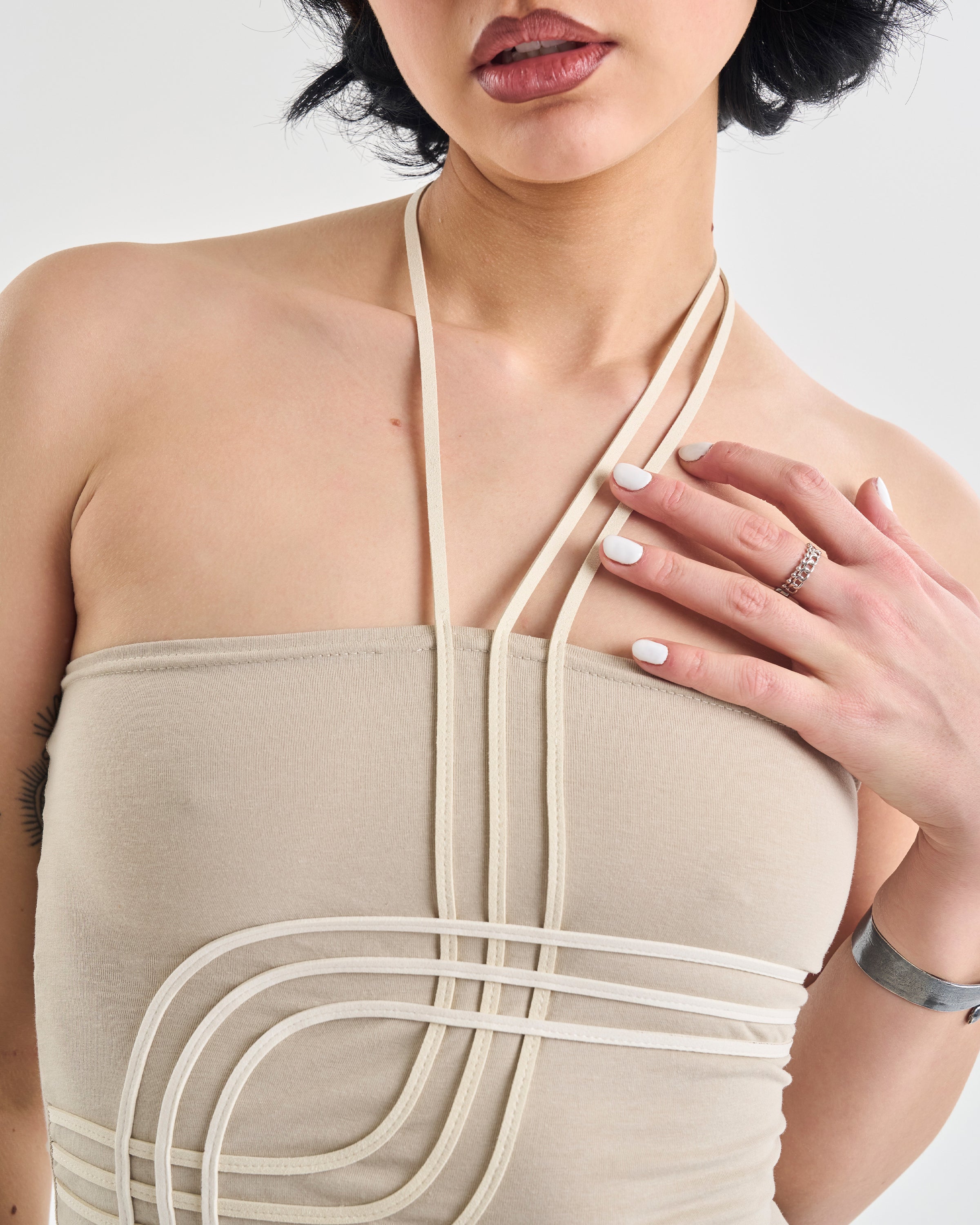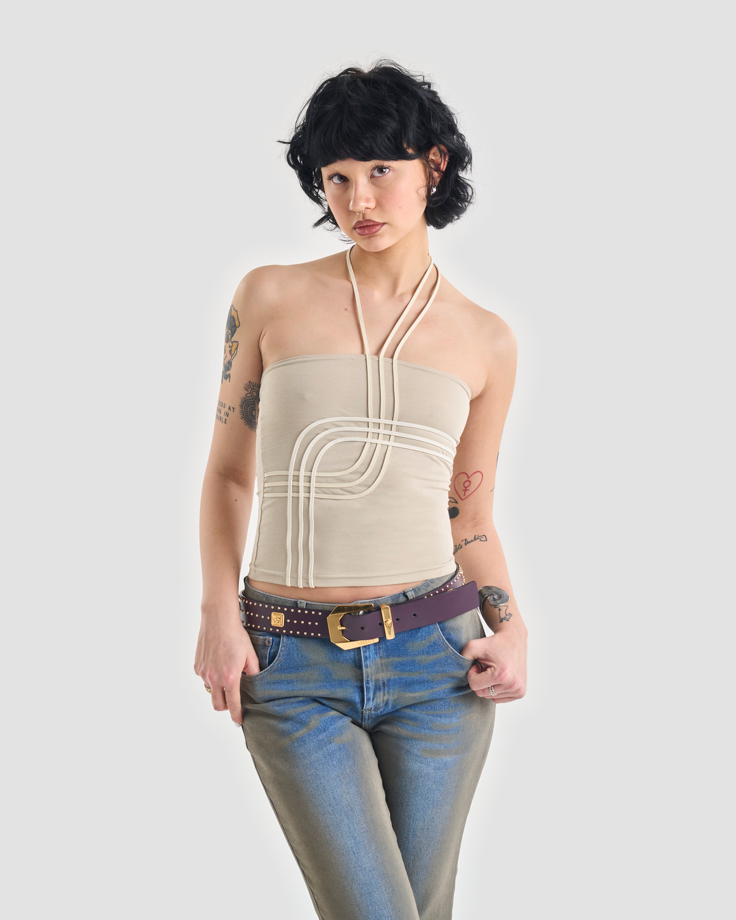 A nineties inspired, tube top with a tie halter neck detail; finished in a soft faux-leather.