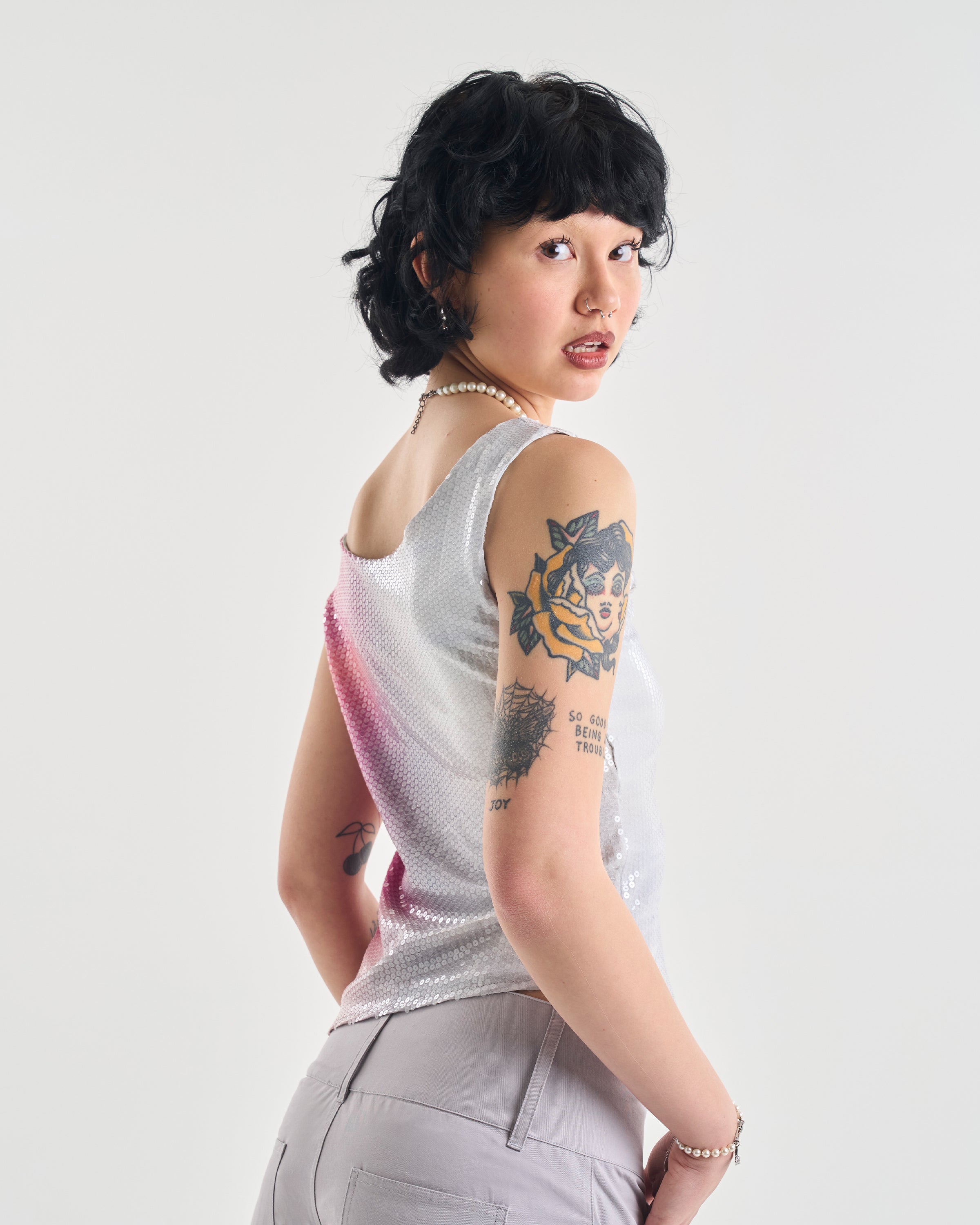 An asymmetric, off-shoulder, sequin top with a soft blue lining. This flattering top features a dynamic print created entirely in-house.