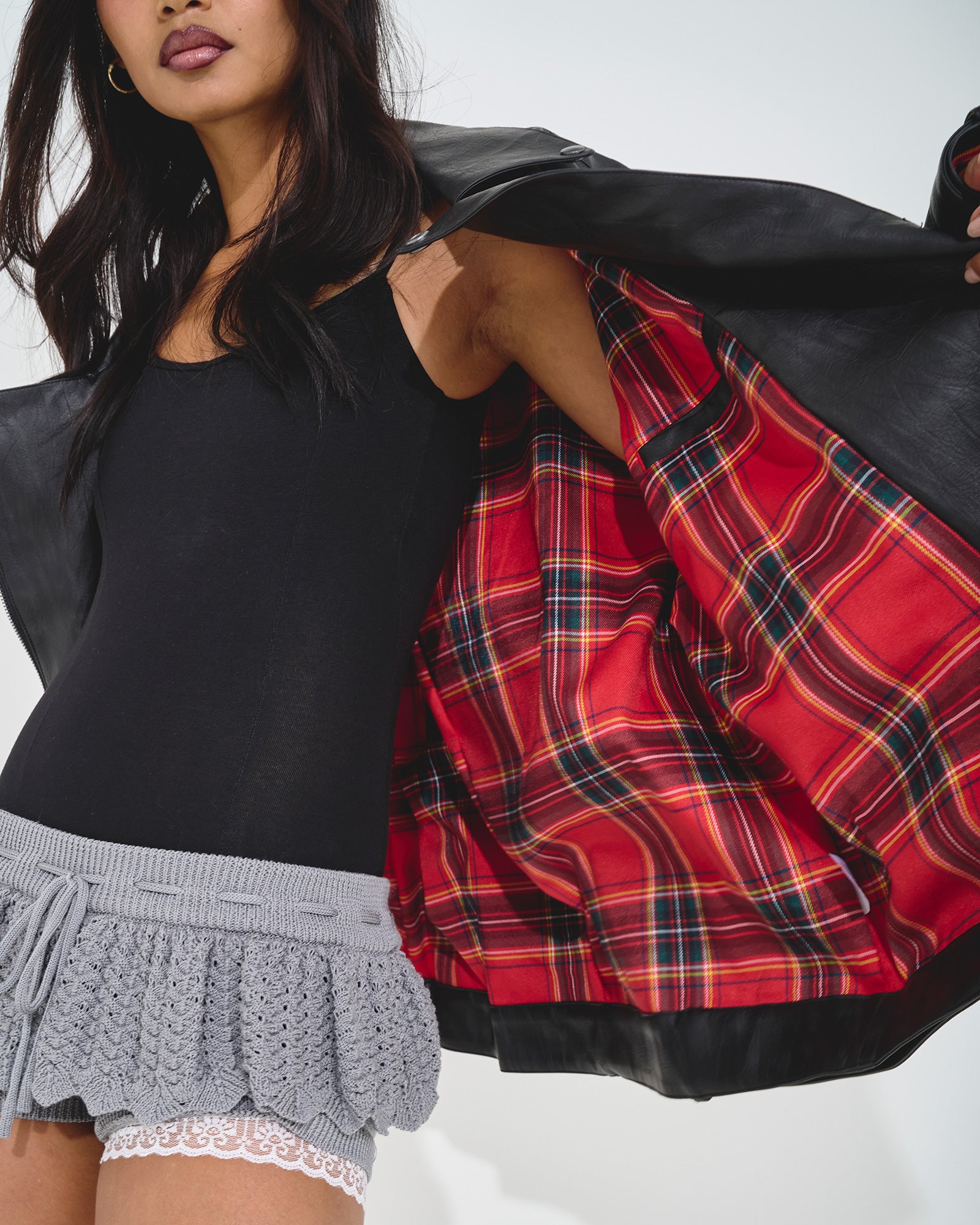 A pair of perfect, grey knit bloomer shorts, with a micro skirt layer. They are finished at the hems with soft lace, and have a drawstring at the waist. Made from soft yarn, with a lot of stretch to ensure your comfort.