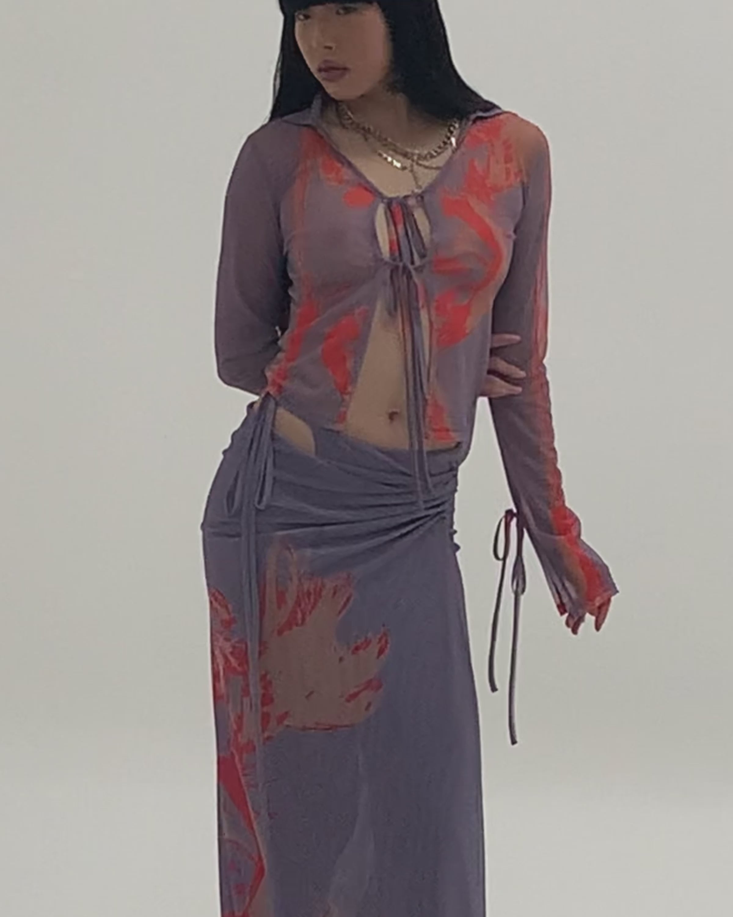 Modern Co-Ord Printed Mesh Shirt with Tie Detail in Purple