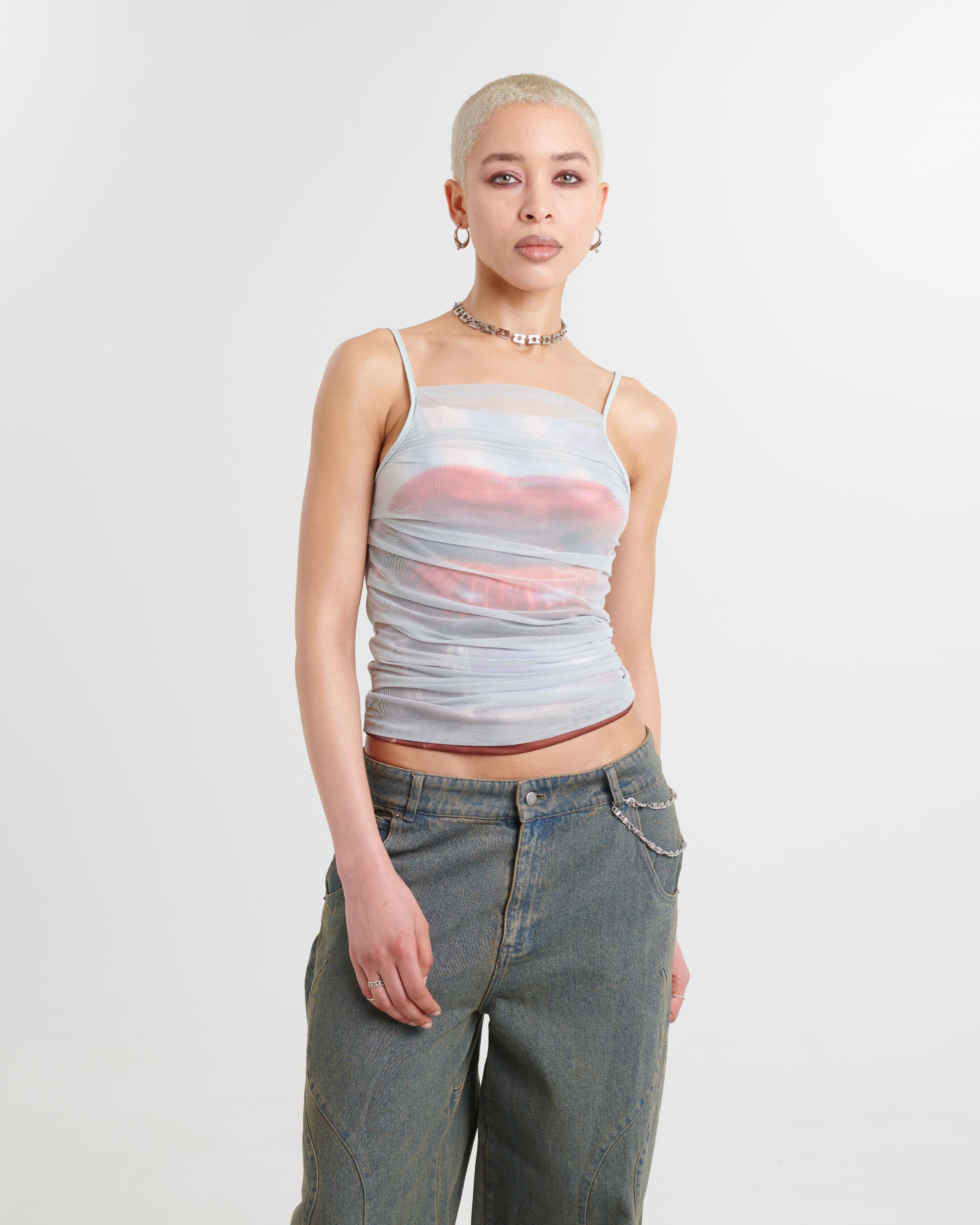 A double layered, printed and mesh tank top. This visual piece offers a unique print made by our talented Graphic Designer using AI and further enhancements. It's then overlayed with a soft contrast mesh. This is an easy-to-wear statement piece.